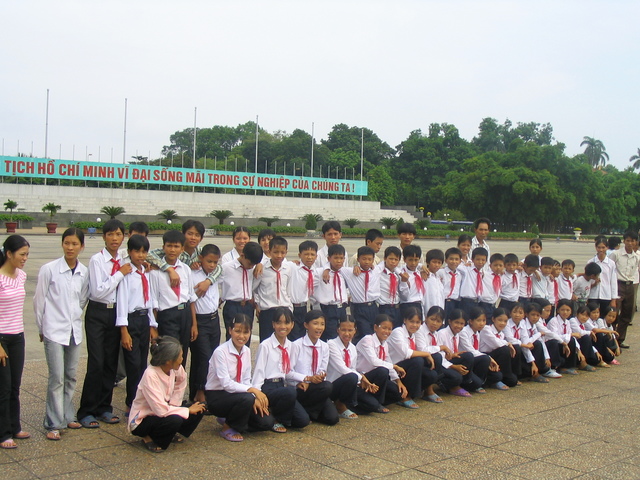 學生團體拍照紀念。後面那排字意思:我們懷念偉大的胡志明主席!