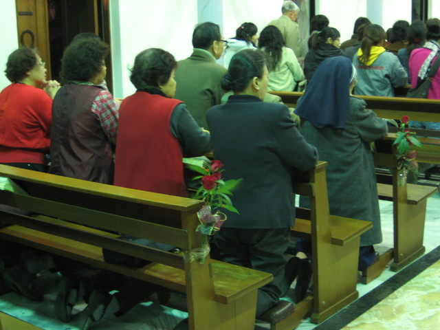 十點多時,彌撒之情形。大家都跪著跟著神父唸聖經之經文。↑