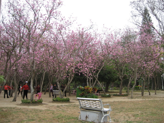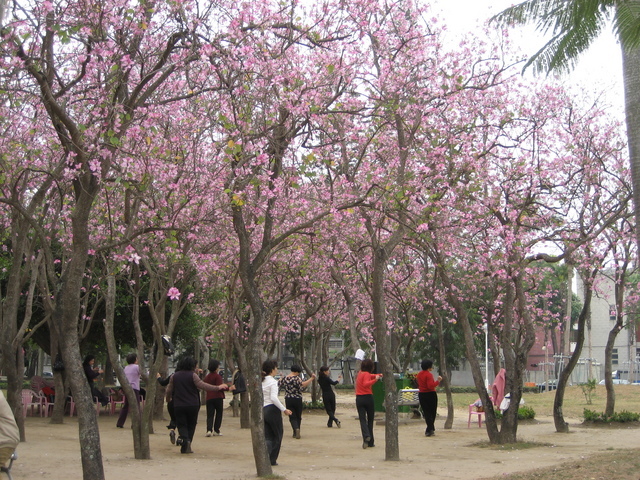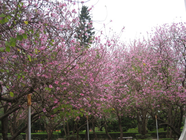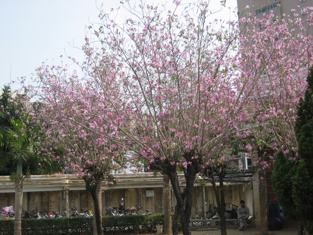 羊蹄甲原產於印度,現在是盛開期。在台南的校園和行道樹上經常可見。(觀賞時請將椅子再往後拉一些,離Screen遠一點,更美) 最美麗還是在台南公園的這一排。很可惜這麼漂亮的樹花,因為植樹時沒有集中,無法看到『數大便是美』。 如果把美麗且有季節的樹花稍微分類,區隔地點,集中植栽,當花朵盛開時必可成為觀光的吸引力。 單棵在長榮中學的校園↓