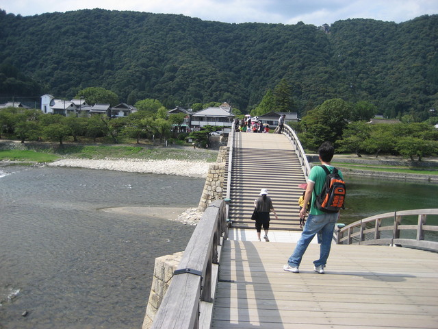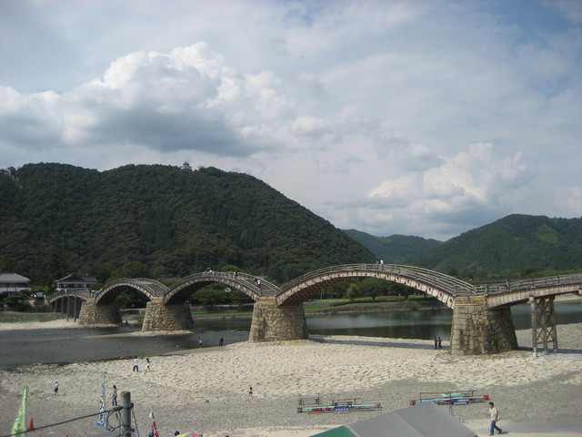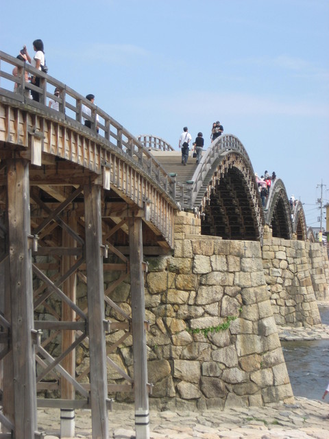 這個錦帶橋位於岩國城的範圍。她底下那條河流叫做錦川。這橋是以拱橋的原理造成,以厚重的石墩承接河水衝擊力,再用檜木組成橋體。木材之間幾乎不用釘,而是用兩端彎曲的粗鐵具緊緊固定。