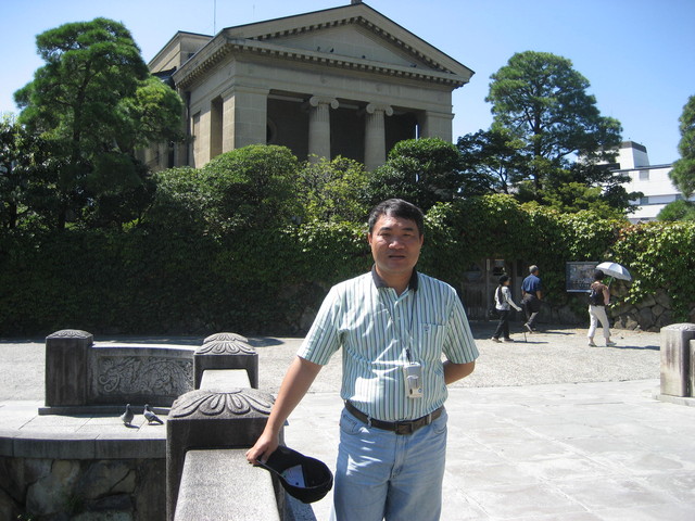 我後面這棟建築物叫大原美術館,是日本第一間西洋近代美術館(1930完工),由大原家族所創立並經營,裕仁天皇來參觀過。三年前我來過一次,館方還幫我們做簡報,我也在裡面參觀很久。它已收藏現代畫作為主。