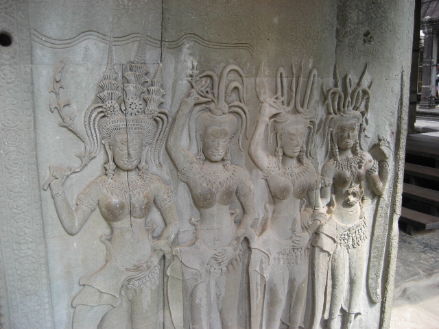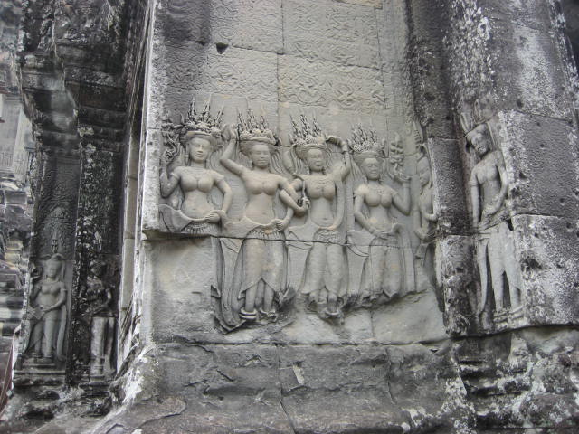 這浮雕叫Devatas源自於印度教,在吳哥建築裡到處可見。她們是女神,全以上空的姿態,呈現女性乳房之美。聽說這裡以前的宮女必全都是上空,這是佛法之最高境界嗎?佛曰:不可說、不可說。