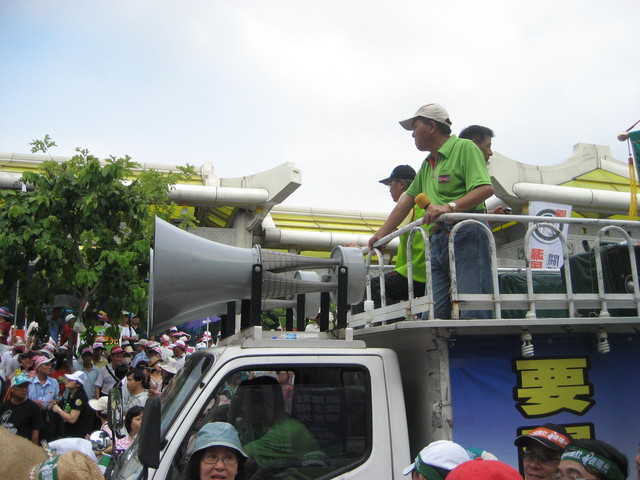 這種叫做民主戰車↓,最特殊是它的喇叭。站在上面必需要拿著麥克風,大聲有節奏地喊口號。它有一個專用術語叫做喊『肉聲』的,不是放帶子的。十幾年前小弟剛出道時,就喊過。沒經驗大概30分鐘就沒聲了。