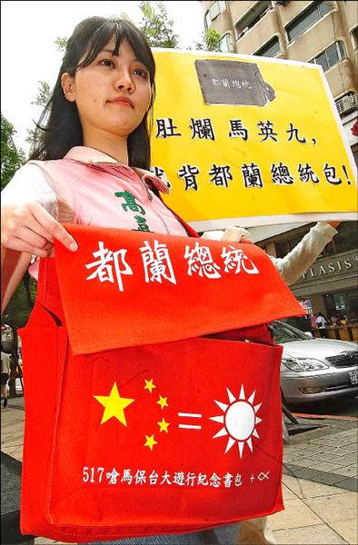 台灣之友會青年部主任高嘉瑜昨日帶著自行設計的「都蘭總統」包召開記者會,呼籲年輕人背著「肚爛」諧音的書包踴躍參加五一七遊行,上街表達對馬英九總統諸多政策的不滿。(記者劉信德攝)↑