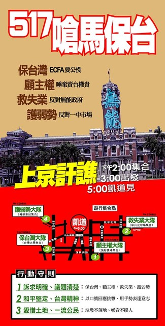 五一七大遊行,嗆馬比創意!台灣國辦公室創辦人王獻極等人昨赴凱道舉行「氣噴馬英九」活動,藉由噴漆表達對馬英九上任一年來的怒氣;前國代高嘉瑜設計的「都蘭總統」書包昨也正式亮相,諷刺人民對馬英九的不爽;近五百名台灣派部落客版主及網友則相約明天沿頂好大道遊行嗆馬,他們並已招募五十名志工,身穿自製T恤、肩揹「獅甲國中」書包,另攜帶「超克GGY─『郭冠英』現象之評析」新書,打算陪蔡英文靜坐K書。
