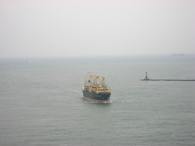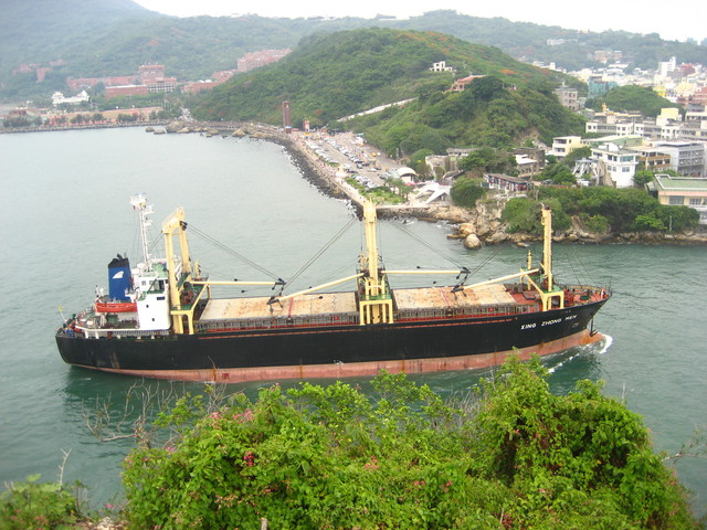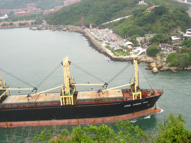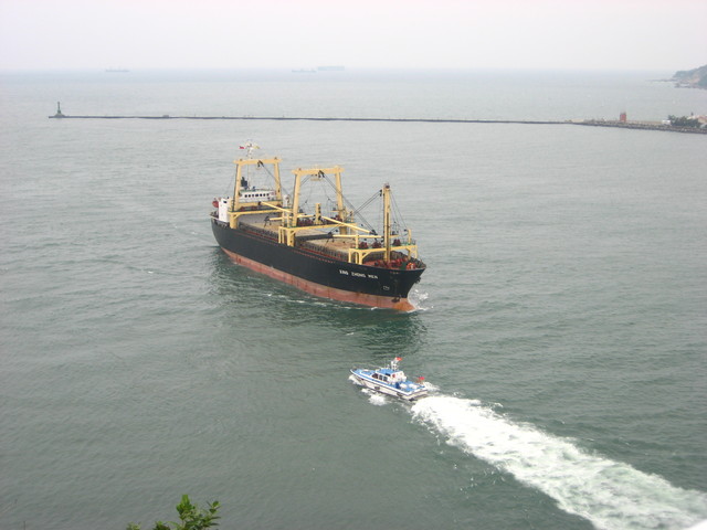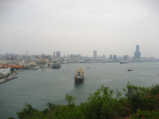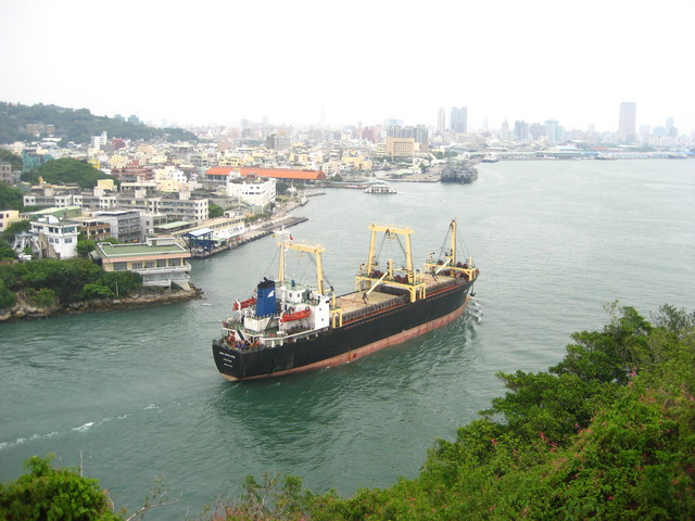打狗,她是少數優質的深水港。 曾經,她的吞吐量名列前矛。 站在海港旁的旗后砲台,我看到大船入港的景象。請大家看吧↓ 你可以看這大小船的比例,就知大船有多大。那小船是海巡署的巡邏艇。