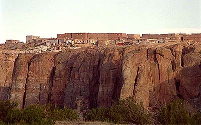 這部落名稱叫做Acoma(原意為天空之城)。它很特別是整個部落建在高山台地(Mesa)。Mesa就是把山頂的尖頭切掉一塊好像我們吃蓮霧把蓮霧頭切掉一塊一樣。